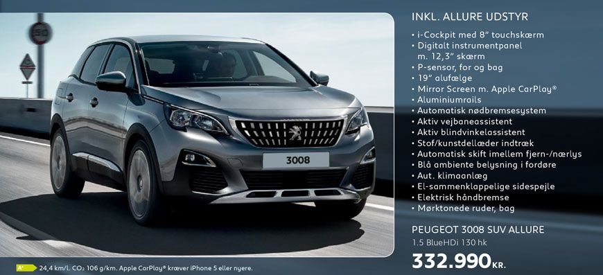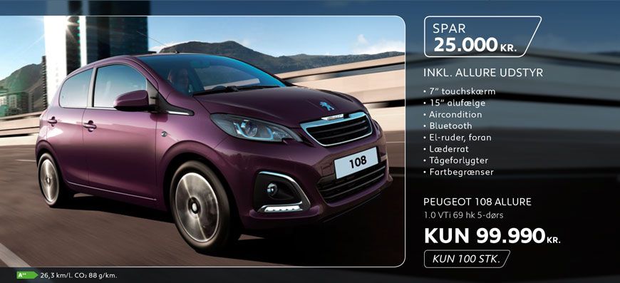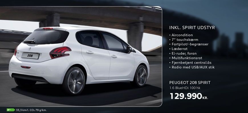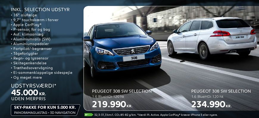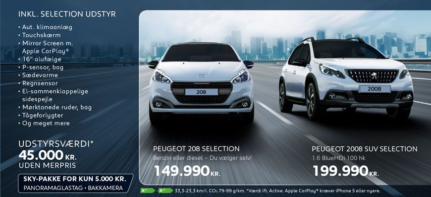 Vi har masser af kampagnemodeller med spændende udstyr til attraktive femstjernede priser. For eksempel kan du lige nu får 208, 2008, 308 og 308 SW inkl. Selection udstyr til en værdi af 45.000 kr. uden merpris.